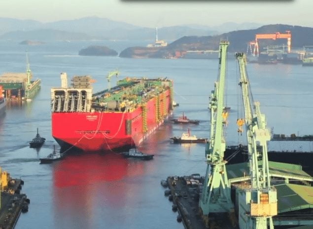 The 488 meter long hull of Shell’s Prelude floating liquefied natural gas (FLNG) plant has been floated out of the dry dock at the Samsung Heavy Industries (SHI) yard in Geoje, South Korea, where it has been under construction for just over a year.