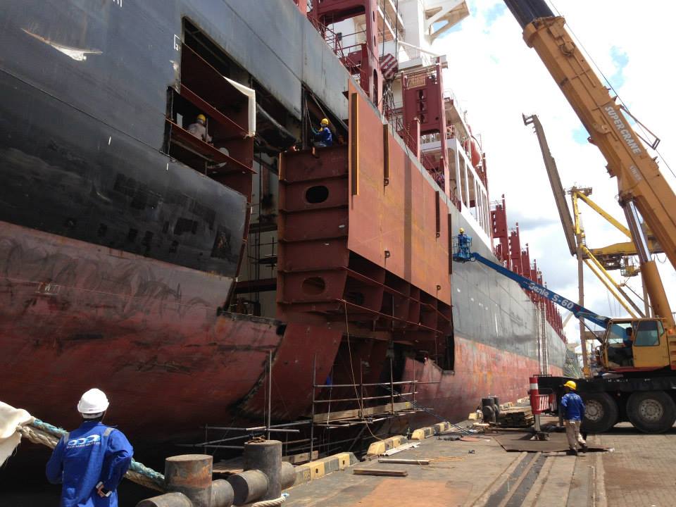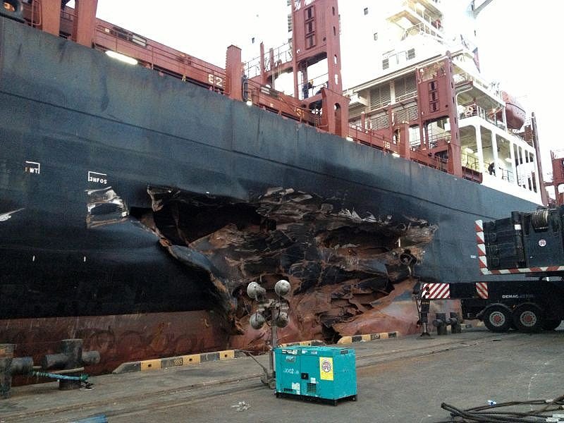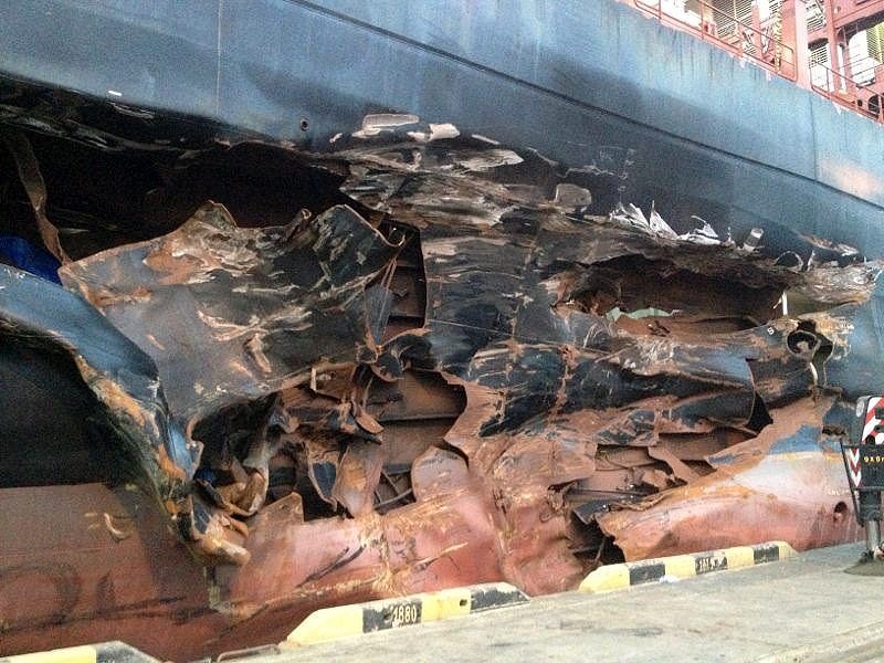 18 containers inside the vessel were damaged as a result of the collision and the ship is now getting patched up at Focus Marine Asia Pte Ltd in Singapore.