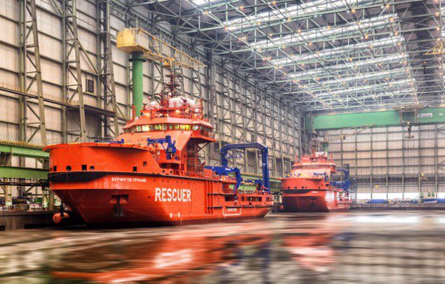 Seventeen months after steel was first cut at Nordic Yards, the naming ceremony for two identical ice-breaking rescue and salvage vessels has taken place today. The Beringov Proliv and Murman were built for the Russian Ministry of Transport (Rosmorrechflot) for use in the Sakhalin region and North-East Passage around Murmansk, respectively.