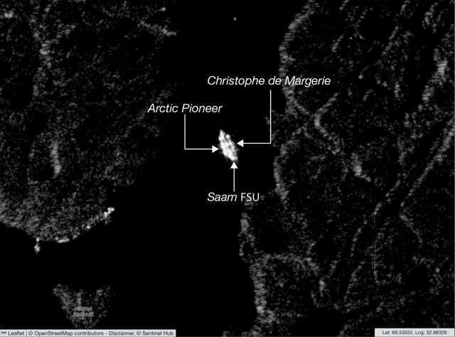 In the operation, the Arc7 ice-class LNG carrier Christophe de Margerie delivered a cargo of liquefied natural gas produced at Arctic LNG 2 to the Saam FSU, while at the same time a conventional LNG carrier, Arctic Pioneer, docked at the storage barge to load cargo for onward delivery. Satellite images confirm two large vessels alongside Saam FSU on January 9.