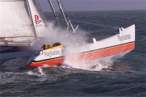 “I clicked on the Playstation link and I had never seen that video before, but I remember when it was shot. We were in the English Channel in December of 2000 and heading to Barcelona for the start of “The Race”. We had just finished putting the new bows on the boat to stop her pitchpoling in big waves. This lengthened the boat from 105 to 125ft long and kept our beam to 60 feet. That video sequence is going UPWIND in about 45kts of breeze at 19 knots of boat speed. (Later that day our downwind boat speeds averaged around 35kts). I was driving the boat at the time and you can see I had one hand on the wheel and one arm hanging on to the boat to stop getting tossed out. Big Cats are QUITE a ride upwind honestly they are WAY more fun offwind.”