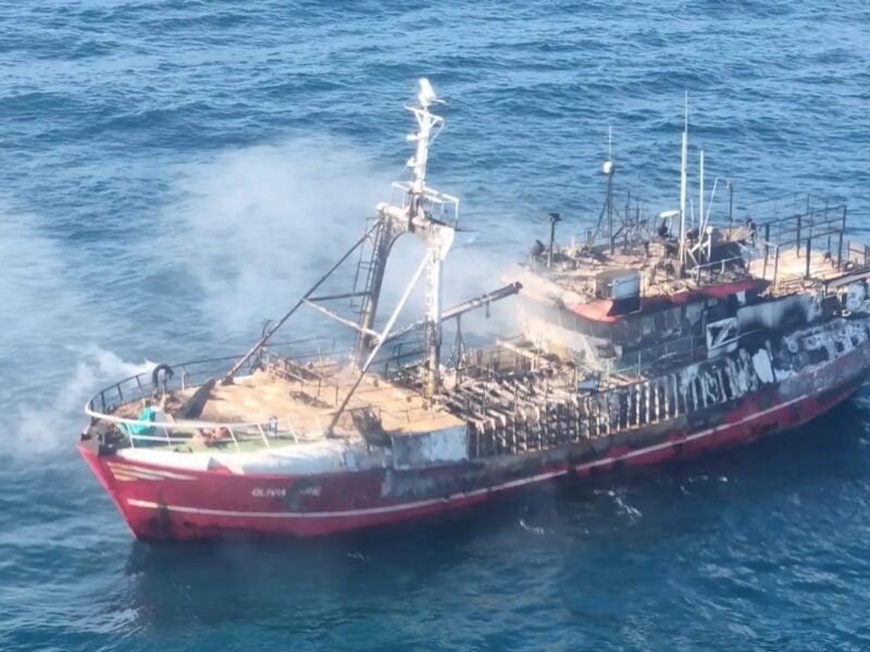 According to the South African Maritime Safety Authority (SAMSA), the crew of the fishing vessel, named Olivia Marie, was forced to abandon ship and take to life rafts when the engine room caught fire. A mayday call from the Maritime Rescue Coordinating Centre (MRCC) in Cape Town alerted nearby ships to the situation and the crew was rescued safely.