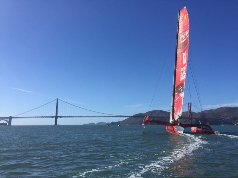 Guo Chuan, 50, departed San Fransisco aboard his trimaran, Qingdao China, on October 18 aiming to set a non-stop solo trans-Pacific sailing world record to Shanghai in 18 days.