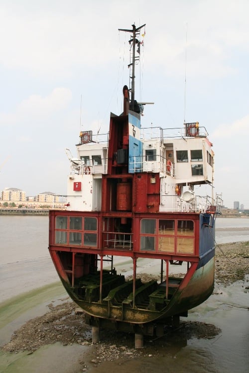 One of the sculptures commissioned for the Millennium Dome, Slice of Reality is looking a little the worse for wear these days, but perhaps that’s part of its charm – after all – when did you last see a ship – whole or otherwise – that didn’t have a few rust stains around the edges?It was created by Richard Wilson (no, not that one) who specialises in making familiar objects strange (thank youMr Brecht) by cutting up architectural forms. He’s most famous for that roomful of used sump oil that Charles Saatchi bought – you know – the one where the viewer had to walk in little channels so they could see the world reflected in the goo. I never saw it myself but anything that is equally loved and hated by the art world must have been worth a view…