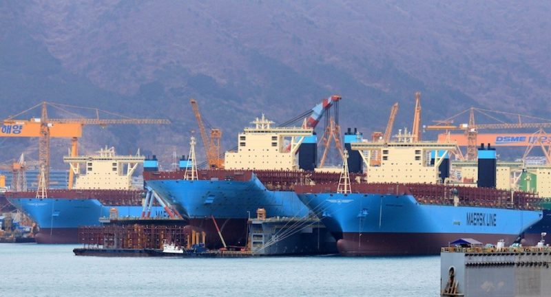 Maersk Triple-E’s under construction at the DSME shipyards in 2014. File photo: Lappino