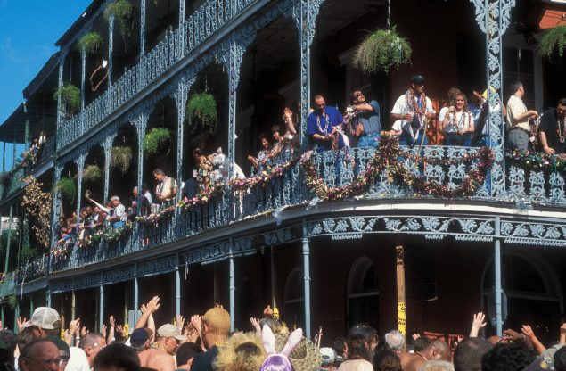 A Bourbon Street balcony during Mardi Gras. Photo (c) Alex Demyan