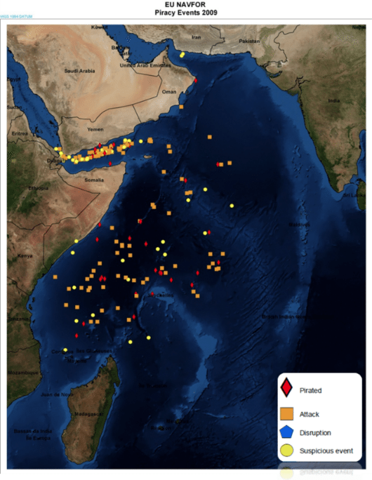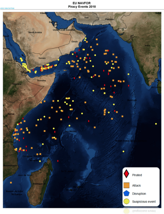 In 2009 you can you see that most of the reported piracy events (ie pirated, attack, disruption, and suspicous event) are focused on the Gulf of Aden and close to the Somali coast. Then in 2010 and 2011, piracy begins to spread into the Indian Ocean and northern Indian Ocean, mainly helped by the use of motherships to stage attacks. Piracy peaked in 2011 with a total of 176 attacks, according to EU NAVFOR data.