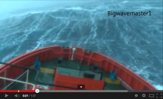 The Grampian Protector, a 44-meter Emergency Response and Rescue Vessel was working in the North Sea last week during the nasty storm Xaver. One of the vessels’ crew took the following video of the ship being tossed about in 100 knot winds and foam-streaked seas.