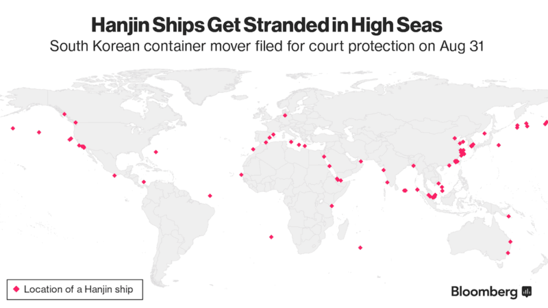 Current location of ships in the Hanjin fleet. Via Bloomberg