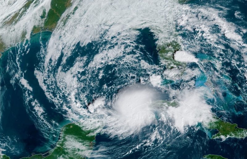 At 9 a.m. CST, the center of Tropical Storm Eta was located over the southeastern Gulf of Mexico about 60 miles (100 km) north-northwest of the western tip of Cuba, November 10, 2020. Image courtesy NOAA/GOES