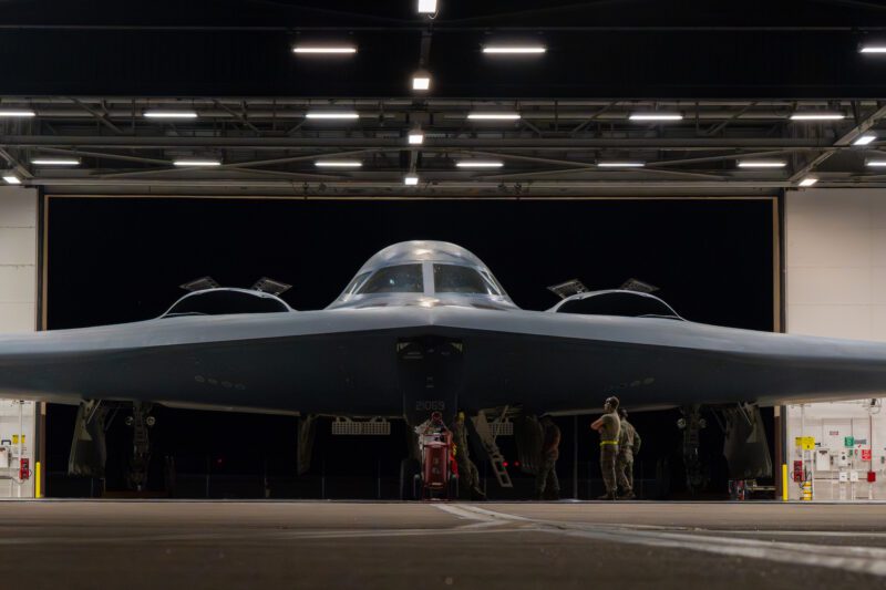 U.S. Airmen assigned to the 393rd Bomber Generation Squadron prepare a B-2 Spirit aircraft carrying Joint Direct Attack Munitions for departure at Whiteman Air Force Base, Missouri, Sept. 2, 2025. The aircraft delivered a maritime strike on surface vessel in the High North, in collaboration with Norwegian Allies, as part of the Air Force Research Laboratory QUICKSINK Joint Capability Technology Demonstration. U.S. Air Force Photo