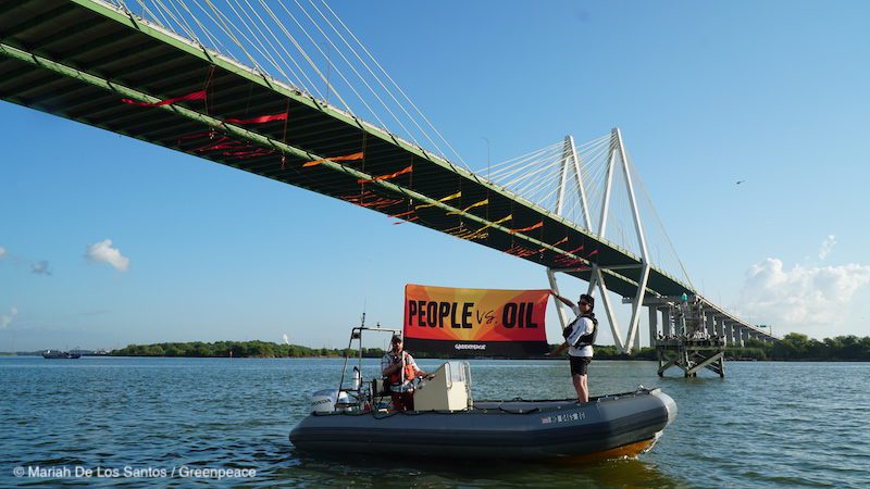 “We’re in the heart of the fossil fuel industry (the largest oil export channel in the U.S.) to confront Trump & the oil industry,” one tweet said. “It is time to end the age of oil,” said another.