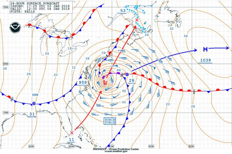 The U.S. National Weather Service on Wednesday forecasted an intense low pressure developing off the Atlantic coast by 7 AM EST Thursday morning with winds up to 80 knots and seas to 33 feet.