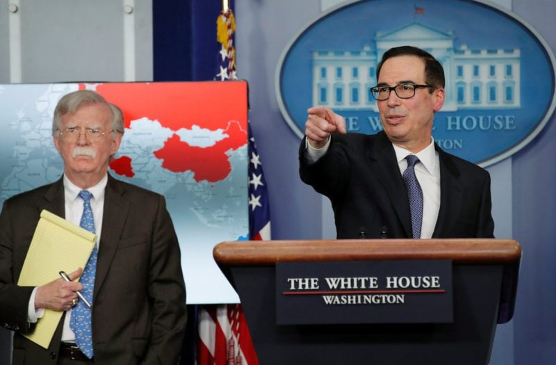U.S. Treasury Secretary Steven Mnuchin (R) and National Security Advisor John Bolton announce the Trump administration’s economic sanctions against Venezuela and the Venezuelan state owned oil company Petroleos de Venezuela (PdVSA) during a press briefing at the White House in Washington, U.S., January 28, 2019. REUTERS/Jim Young