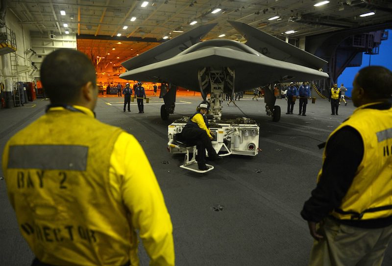 (May 13, 2013) An X-47B Unmanned Combat Air System (UCAS) demonstrator is towed into the hangar bay of the aircraft carrier USS George H.W. Bush (CVN 77). George H.W. Bush is the first aircraft carrier to catapult launch an unmanned aircraft from its flight deck. (U.S. Navy photo by Mass Communication Specialist 2nd Class Timothy Walter/Released)