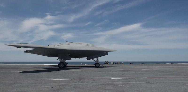 ATLANTIC OCEAN (May 14, 2013) An X-47B Unmanned Combat Air System (UCAS) demonstrator flies over the aircraft carrier USS George H.W. Bush (CVN 77). George H.W. Bush is the first aircraft carrier to successfully catapult launch an unmanned aircraft from its flight deck. (U.S. Navy photo courtesy of Northrop Grumman by Alan Radecki/Released)