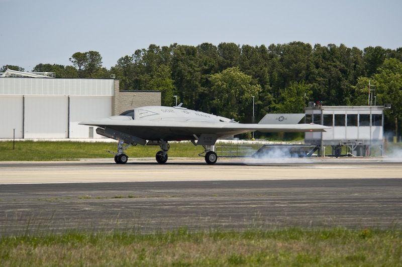 (May 14, 2013) The X-47B Unmanned Combat Air System (UCAS) demonstrator lands at Naval Air Staion Patuxent River, Md., after completing the first launch of an unmanned aerial vehicle from an aircraft carrier. (U.S. Navy photo by Kelly Schindler/Released)