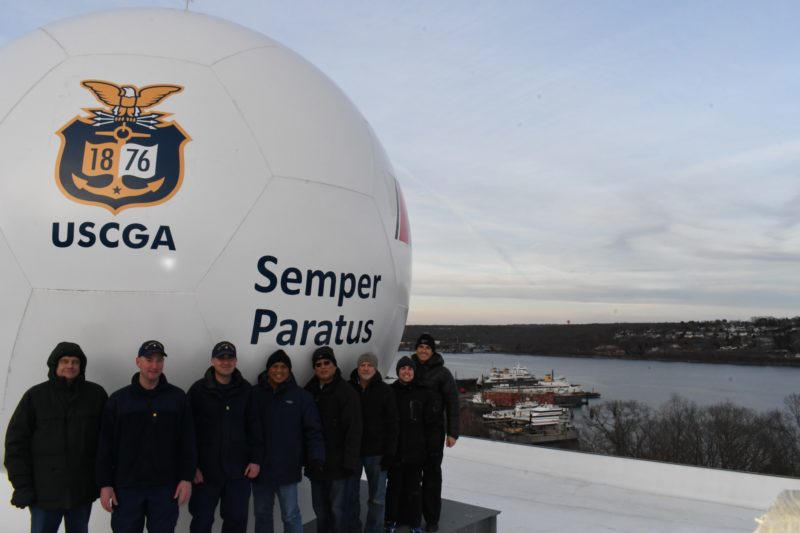 Members of the antenna construction team pose for a photo outside the radome atop of Smith Hall at the Coast Guard Academy, Jan. 1, 2019.