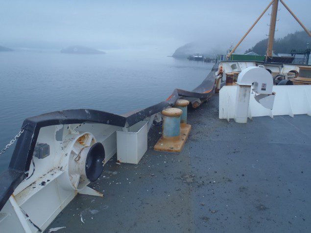 A section of the Coast Guard Cutter Sycamore’s port bow sustained damage from an allision with an Alaska Marine Lines barge while moored in the harbor of Cordova, Alaska, July 28, 2013. (U.S. Coast Guard photo by Coast Guard Cutter Sycamore)