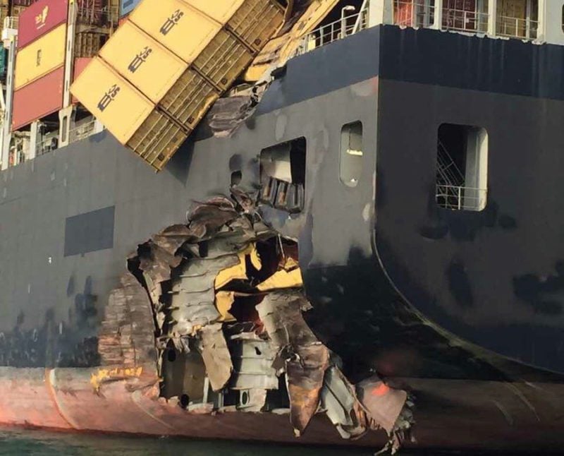 The supertanker sustained damage to its bow in the collision. The MSC Alexandra took the hit at its port quarter, causing a giant hole and the loss of containers overboard. Both vessels are in stable condition and anchored in Singapore waters, the MPA said. Below is photo showing damage to MSC Alexandra (more incident photos added below):