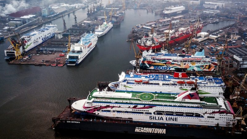 According to the website PortalMorski.pl, which shot the video just a few days ago, the footage actually shows a record seven car and passenger ferries at the yard, including one there undergoing conversion to LNG propulsion and another that arrived all the way from British Columbia, Canada.