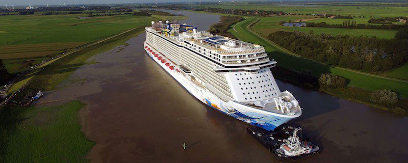 The 164,600 gross ton Norwegian Escape on Saturday completed its River Ems conveyance from the Meyer Werft shipyard in Papenburg, Germany to the North Sea.