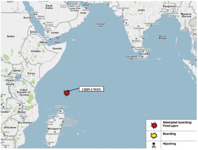 INDIAN OCEAN: Fishing vessel (CHIN I WEN) hijacked on 3 November at 2100 UTC while underway in position 06:10S – 051:10E, approximately 722 nm northeast of Dar es Salaam, Tanzania. On 5 November, the crew regained control of the vessel and rendezvoused with a warship that provided assistance. All 28 crewmembers survived the incident, and the vessel proceeded to a safe port. (IMB)
